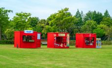 香草园广场:香草园广场是香草园的主入口处,与生态园广场南北相对,共同构成了迪士尼地铁站的餐饮休闲商业圈。广场建筑采用了新颖的清水混凝土水管作为建筑的空间构筑物,与木质外墙共同构建了一个独特质朴的香草园入口大门。