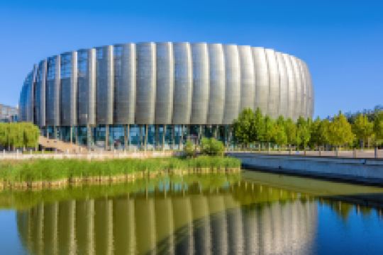 德州大剧院坐落于德州市文体中心东南角,东临康博大道,南临东方红路。是德州大剧院较为引人注目的演出场所。 大剧院外部,二层平台上的主入口及两侧弧形的竖向穿孔板造型像迎风扬起的风帆,宛如一幅徐徐拉开的文化艺术大幕。 大剧院总体采用与周边环境相契合的曲线式布局,以舞台塔为中心,主体造型为椭圆形,巧妙地延伸出弧形墙体,形成富有韵律的音符造型,灵动而有节奏感;外部广场则采用了浪花寓意的景观设计,生动而富有韵律。