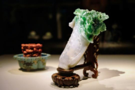 「翠玉白菜」工匠顺应翠玉天然的色泽,以浓重的深绿色表现层层包覆的菜叶;白色部分虽有裂痕及杂质,但在巧妙的安排下,转化为新鲜、饱含水分的白菜茎部。