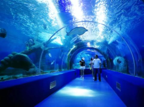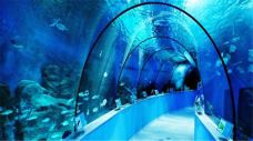 海底隧道区:海底隧道全长35米,储水2500多吨,穿越海底隧道,您可以欣赏到种类繁多的海洋大型鱼类,有善于伪装的深海巨斑,飞翔飘逸的鳐鱼,带人毒刺的牛鼻鲼,色彩鲜艳、成群结对的圆燕、体型庞大的护士鲨等等,你还可以观赏到巨型的海螺、安徒生笔下的美人鱼、珊瑚礁等美丽景观。