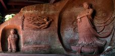 东方佛都,与乐山大佛一门相通,同在乐山市的凌云九峰,世界双遗产保护范围;辖山林地近千亩,是以大型佛像群为主体的国家4A级景区。东方佛都,林隐千佛,洞中百窟;是现代人,循唐代风貌,用传统石刻技法,留下的摩崖造像的痕迹。而今,世人称之为中国的第五大石窟群,一点不为过。景区自开放二十多年来,接待了上千万游客,得到了国内外众多著名行家的好评。景区的规划借鉴了中国的四大石窟群:敦煌、云冈、龙门、麦积山。这些佛像圣地,除一尊大佛闻名外,四周还有众多的石窟群,众星捧月,而乐山大佛,仅有一尊巨佛,有别于这四处,也有别于华夏建佛的传统。或许,海通当年凿乐山大佛时,也曾有过像四大石窟群一样的构想,只因乐山大佛过于宏大,凿造的工期耗时九十年,历经三代人,又加之经费短缺而未成就。或许,“峰各有寺”,香火鼎盛的唐代,凌云九峰就有四大石窟群一样的格局,只因后来的外患毁去。无论是先人未竟的事业,还是寻古复旧,都是今人应该去完成的宏愿。故而,这里在规划时,没随当时全国大搞微缩景观的潮流,而是以乐山大佛为核心,布局与其相匹配的大而美的佛像石窟群。其间,不乏借鉴了四大石窟群的部分精髓,结合本地实貌,规划出“林隐千佛,洞中百窟”的方案。此方案,得到了中国雕塑鼻祖、北京人民英雄纪念碑浮雕的设计制作者刘开渠大师的首肯,得到了卓越文物建筑家罗哲文、郭旃等人的签字认可。东方佛都的施工乐山大佛,是世界第一巨大的摩崖造像。所谓摩崖造像,就是在原石上直接凿造。它要与乐山大佛融为一体,也只能按先人传统的技法,摩崖造像,且佛像不能小。内行都知道,大而美的摩崖造像,是很难凿造的,这得需要雕塑家制作样品,匠人手艺精湛及得天独厚的山石。凌云九峰的山石,丹霞岩,内核无缝,几座起伏的凸峰,就像一坨完整的磐石,世间少有,天生就是凿造摩崖佛像的场所。海通当年选址于此,确实独具慧眼。东方佛都公司为了成就千秋大业,不惜花重金去四川美术学院,请当年创作《收租院》轰动全国的那批老中教授。前来主持造佛工程的四川美术学院雕塑系主任冯宜贵教授说:“四川美术学院集体做过两个大型雕塑群,一个是《收租院》,另一个就是东方佛都。”参加这里塑佛的四川美术学院老教授有郭其祥、王官乙、伍明万、龙德辉、冯宜贵及中年教授刘威、孙闯、谭云、袁成龙等雕塑家。参加凿佛的匠人,都是四川美术学院教授们带来的技工。李定红、唐启书等个人技艺都获得过国家奖证。这些雕塑家和技工,在佛像上献艺,历时多年,尤其是袁成龙教授主持实施的600多米长的地宫。众多的雕塑家和技工,在佛像上打擂比艺,各显神通。他们充分利用自然地貌,天赐神石,依山取势,采用圆雕、浮雕、壁画等多种形式,打造出了大小上万尊佛像。在凿造的过程中,难度很大的,是匠人在山崖上近距离作业,无法识别所凿佛像的局部与整体的比例。摩崖造像,又要求匠人一次成像,若鼻子打歪,原石上不能补缺,只能毁像重来。海通法师当年凿造乐山大佛的伟大,我们在实施建筑的过程中,才真正体会。即便是现在,我们用现代仪器,远处设观察点,用军用望远镜卡尺,卡算出佛像各部位的比例,用对讲机指挥施工,也很难加快工程进度。更难的是,建造之初,我们想当然地认为,先人凿造摩崖造像,是按乐山大佛陈列馆里井架林立的模型搭架施工的。殊不知,大谬不然。面对山崖搭架,施工中大块凿掉的石料,砸向井架,架塌伤人。实践中,我们才揣摩到,海通当年凿造乐山大佛,匠人是腰系绳索悬空作业,由上至下,一层一层剥下去的。看似简单的施工,行进中遇到的挫折不少。我们边摸索古人的技法,边艰难力行。它的特色这里囊括了世上的精品佛像,包罗了各派的佛文化内涵,与乐山大佛相得益彰,浑然一体。景区的佛像,林林总总,依山而就,错落有致,古朴自然;既大且美,远看气势,近看精细;尤其是地宫,金碧辉煌,群佛荟萃,简直就是山中的极乐宫殿。景区的植被,香樟成林,曲径通幽。亭榭疏落,野趣横生;精美的群佛,褪去人工痕迹,隐现于山林,既保留了原始的自然生态,又透现出丰富的人文情怀,再现了唐代凌云九峰。其观赏效果,正如景点创始人当年所憧憬的那样:“清水出芙蓉,天然去雕饰。”景区主要景点第一节 万佛洞中国很大的石窟群,总长700多米,在山洞里,气势恢宏,世上无双。洞窟由南往北,六个部分组成:南窟、南过道、中窟、北过道、北窟和地宫。其中地宫,游人见了无不叹为观止。地宫 殿 殿长36米,宽15米,高13米。四大高9米。四大是佛教的护法天神,中国佛教徒认为南方增长持剑,司风;东方持国拿琵琶,司调;北方多闻执伞,司雨;西方广目持蛇,司顺,组合起来便成了“风调雨顺”。释迦牟尼坐佛像 通高33米,是在世界上也算规模宏大的山中佛,在原石上雕刻而成。达摩祖师洞 通长56米,宽17米,高13米。达摩祖师,原印度人,为中国禅宗的始祖,故中国的禅宗又称达摩宗。达摩祖师像高10米。石刻八百罗汉 目前国内仅有,千姿百态,栩栩如生。药师佛洞 全洞长45米,宽23米。药师佛高51米。药师佛又作药师如来、大医王佛、医王善逝等,为东方净琉璃世界之教主。第二节 大佛湾三面群峰环抱,三重殿垂直下来,像一把龙椅。两旁的佛像从北魏至宋。第三节 观音窟媚态观音 高9米,姿态优美,婀娜端庄,有“东方维纳斯”的美称。 
