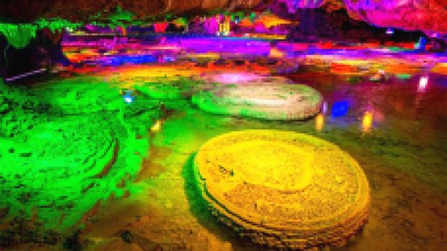 莲塘奇观,水面飘浮着大大小小108块如荷叶的云盆,盆中满盛天然穴珠,又称溶洞珍珠,大小、形状、颜色与莲实同。仙莲倒挂,进口处簇簇乳石,如片片莲瓣,橡一朵硕大的莲花,高悬洞顶,华丽夺目。堪称世界顶级奇观。