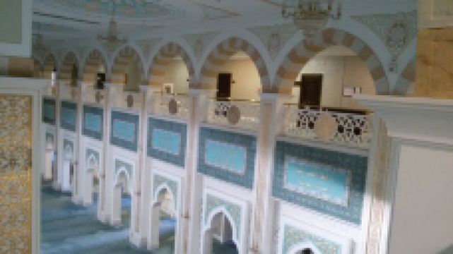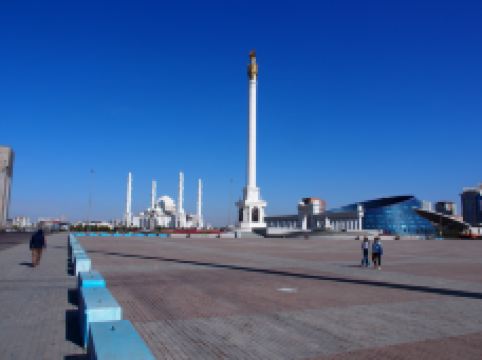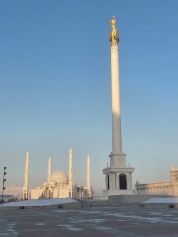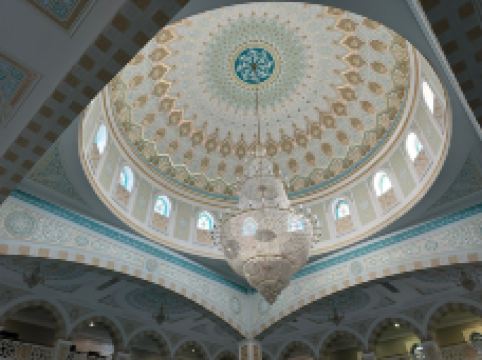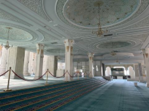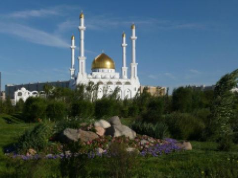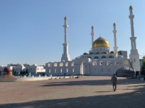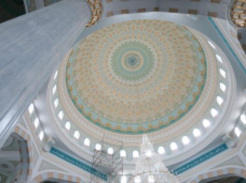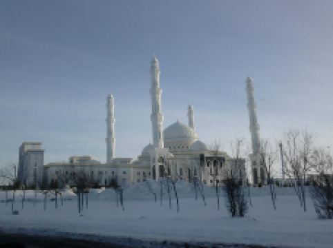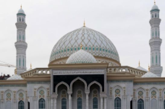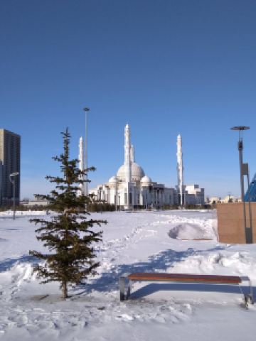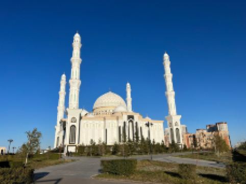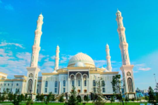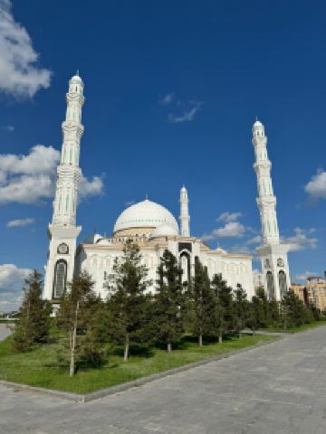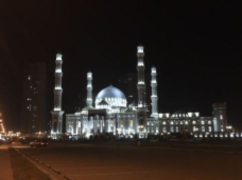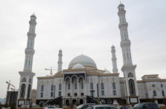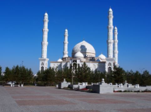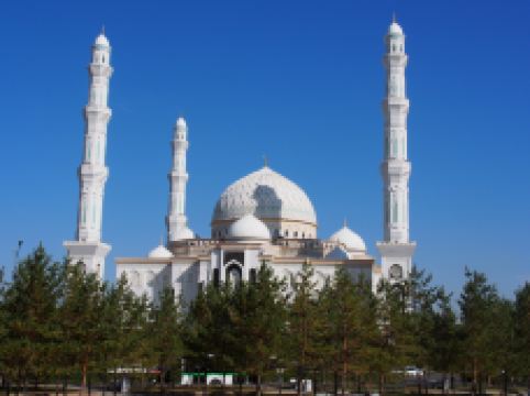 “哈兹拉特苏丹”清真寺是哈萨克斯坦较大的清真寺,也是整个亚洲地区除了西亚以外很大的清真寺,室内室外共可容纳5000到1万人礼拜。清真寺总体色调为白色,在中亚大草原黄昏的余晖中,散发出冷峻的光芒。年轻的“哈兹拉特苏丹”清真寺也有自己的镇寺之宝。