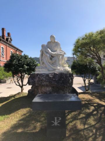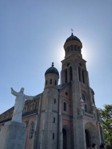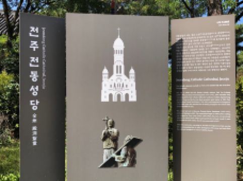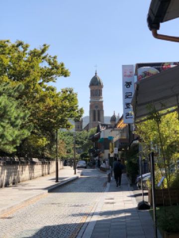 殿洞圣堂是竣工于1914年的近代西洋式建筑物,被称为“全罗北道和南道地区中规模大历史久的历史建筑物”,是来全州来朝圣的地方。殿洞圣堂座座瓦房高耸入云,完整地保留了罗马的建筑风格。不仅外观特别,内部设计更是精巧好看,仔细看玻璃窗和彩绘的屋顶还有介绍殉教的图画。教堂院内绿化的效果很好,几棵苍翠松柏,几簇野花,角落里都是风景片。教堂内院的左手边有一棵特别粗的大树,直径大概有几十个人围起来宽,年轮层叠浸出岁月的痕迹,足以见其历史悠久,树影斑驳,也是乘凉好去处。