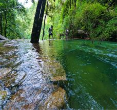 青龙大瀑布位于武夷山九曲溪的上游,瀑布周围的森林十分茂密,森林群落近乎原始,所以空气非常好。中亚热带的生物物种在这里都能找到踪影,峡谷游道两边挂牌的珍稀观赏树种就有100多种,来此可以看到许多平时比较难见的珍稀树种。主要的景点就是瀑布本身,瀑布由三级大瀑布群组合而成,深谷绝壁上,一条大瀑布犹如青龙从峡谷间呼啸而出,气势宏伟壮观。它长200多米,落差120多米,宽处40余米,呈阶梯状。一道道水波飞流而下,直泻深谷,让人真切地感受到大自然无法抗拒的魅力。到了地方后,需要过个小桥,这个小桥也算这里的一个景点,叫做“一步桥”,原因就是桥很短,可一步跨越,跨过这一步即进入景区。其他景区景点有石乳青冈、灵蛇炼石、青蜥望水、乱石粼波、通天桥、翠玉朦胧、十八重山等。都是指这里的各种自然景象。在石头上的树叫青冈,灵蛇炼石是指弯弯曲曲的树根像蛇一样缠绕在岩石上。通天桥是进入岩生群落前的一座桥。过桥后就是原始森林区,能看到岩生植物群落、藤生植物群落。翠玉朦胧是指在瀑布底下,溪水平缓的地段会形成潭,潭水碧绿,就像天然的翠玉。瀑布的正方有一重重高山,即为十八重山。远离人群、看瀑布,亲近自然,爬爬山,呼吸新鲜空气,就是来此的主要目的。