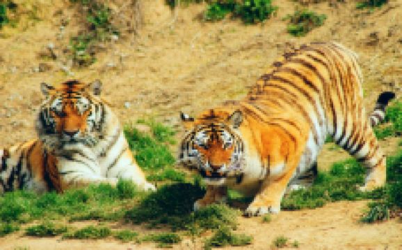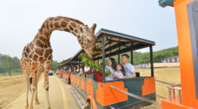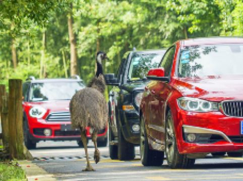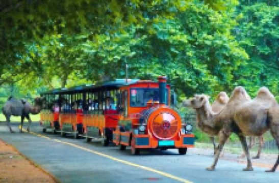在森林小火车站乘景区的小火车继续往内,行车区散养着来自亚洲、澳洲、非洲、藏北等世界各地的大型动物,坐在车上,你可以看到帅气的非洲狮、英俊的老虎、性感的斑马,还有一脸无辜地望着你的驼羊,骆驼和鸵鸟有时会走到车边好奇地和你打招呼。另外,车上还有讲解员带你了解这些动物们的故事。