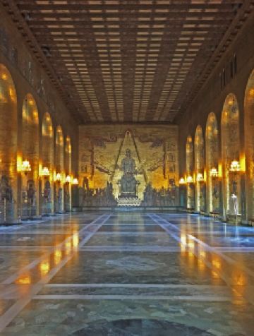 二层的金色大厅四壁用约1800万块约一厘米见方的金色马赛克装饰,壁画展示了斯德哥尔摩的历史,在明亮的灯光映射下,整座大厅金碧辉煌,熠熠生辉。