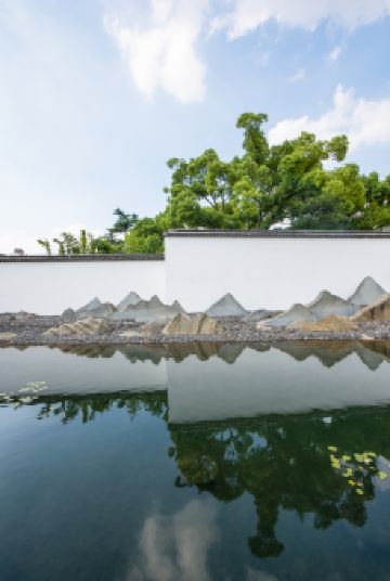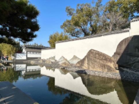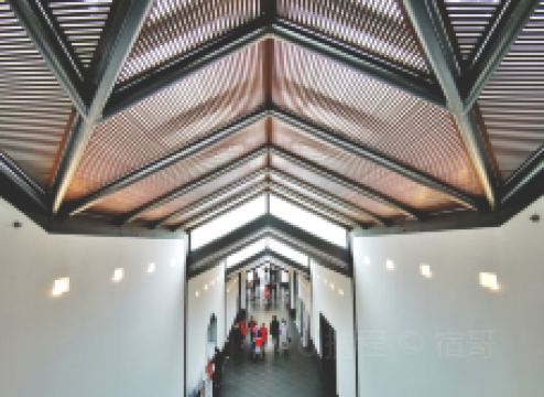 新馆大门是入口,忠王府大门是出口。进馆后可以好好欣赏一下这座新馆建筑,它由建筑大师贝聿铭设计,有着传统的苏州园林风格,高低错落,深灰色屋面与白墙相配,清新雅致。屋顶上金字塔形的玻璃天窗让博物馆内充满自然光线,在大门、天窗廊道、凉厅及各展厅都可以看到这个特点。馆中还有庭院、水池、石桥,既传统又现代。漫步在新馆庭院中,蓝天、白墙、绿竹、清水,十分惬意;走在石桥上还能看到白墙下用砂石堆砌而成的画,很有特点,不妨拍照留念。