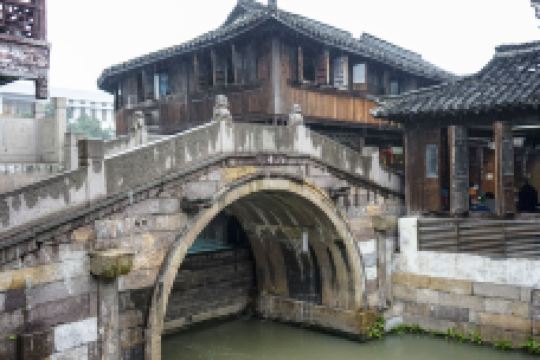 茅盾故居前的三里塘河上有7座桥,纵横交错,各具形态,每隔60米有一座,宛如“桥博物馆”。走上古帮岸,穿过木廊棚,来到有名的应家桥,这是单孔石拱桥。相传吕洞宾正月下凡到修贞观,扮为老头在应家桥上卖汤圆,大的卖3纹钱,小的卖5纹钱。乌镇人都说,茅盾儿时也是经常到这桥上走走、玩耍,才这么出名的。