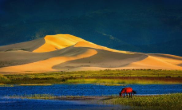 在辽阔的草原上,奇妙地出现了一座长约五公里,以石英长石堆积而成的沙山,山呈东北-西南走向,西缓东陡。脚下有条小河蜿蜓流过。当人们从沙山顶往下滑时能听到从山的内部发出的声音,犹如万马奔腾,海潮汹涌,故名鸣沙山。