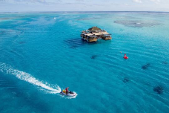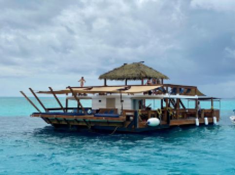 酒吧选址于珊瑚生态区,透明海水下可见热带鱼群穿梭,浮潜者可借免费装备探索周边浅礁。每日限流登岛的设计平衡了生态保护与体验感,午后常有驻场DJ搭配海浪声营造松弛氛围。晴日里云影掠过木质甲板,暴雨时则转为半封闭的听雨空间,天气变化成为场景切换的自然脚本。 抵达需乘机动船穿越岛礁密布的水域,航程中可见传统斐济村落与火山地貌。