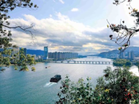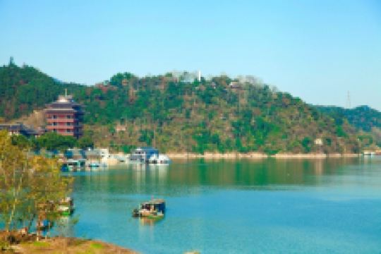 桐君山位于富春江与分水江交叉处,与桐庐县城仅一水之隔,是离市区近的景点。这里景致清幽,相传是“鼻祖”桐君老人结庐的地方,不仅山中的景观大多与此有关,就连“桐庐”的地名也由此而来。桐君山本身是一座挺小的山峰,高度仅有60多米,不到1小时就能游览完毕,很适合带老人小孩一起休闲散心。桐君山可免费游玩,如果打算乘坐景区内的“七里扬帆”游船,则需单独购票。登桐君山进入景区大门,首先看到的是桐君老人塑像,他肩挂药葫芦,后背箬叶帽,慈眉善目。塑像不远处的百草园中种植着马蹄径、枸骨等中材料,都是行疗愈病的良药。走过“药祖之乡牌坊”正式开始登山,在绿树掩映丛中,可见一幢青砖灰瓦马头墙的徽派建筑叶浅予故居(富春画苑),再走上百余级石阶便能到达山顶。山上一座七级桐君白塔是桐庐县的标志景观,不妨在此拍照留念。站在山顶的四望亭,远眺两江的碧水波涛在脚下合为一股,破有几分诗情画意。此外,登山途中还会路经四方药局、桐君祠、桐君亭等建筑,简单游览即可。乘船七里扬帆距离山下百草园不远处,便是“七里扬帆”的游船码头,比起同是乘船游览富春江的严子陵钓台景区和建德的七里扬帆,桐君山的游人通常要少些。游船从桐君山往富春江上游开,过富春江二桥到达富春江一桥后折回,全程大约40分钟。游船的发船时间根据人流量调整,通常需要5-10人才开船,因此旅游淡季时,散客好前一天打电话景区确认第二天是否有团队,更能确保有船可乘。