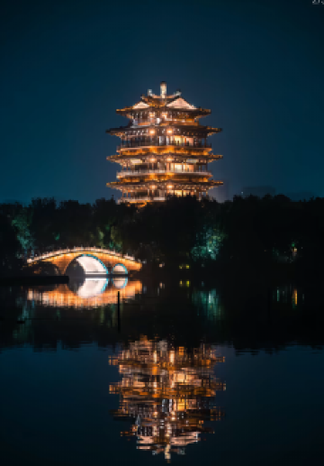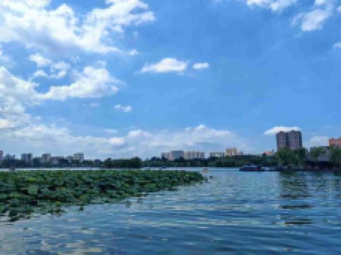 从这里继续坐游船前往景区北部,靠近东门处有一座“汇波楼”,登上汇波楼向南可眺望佛山,向北可眺望鹊华桥,而汇波楼下则是清澈的湖水。每当夕阳西下,湖面上波光粼粼,这便是16景之一的“汇波晚照”。