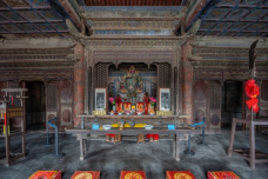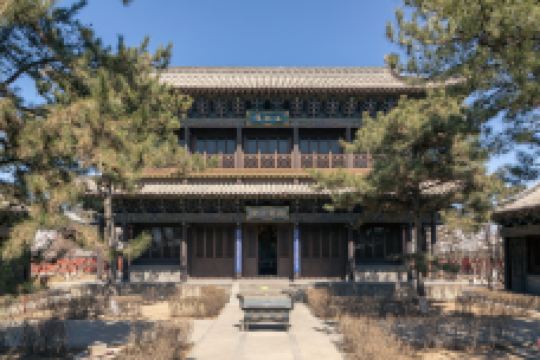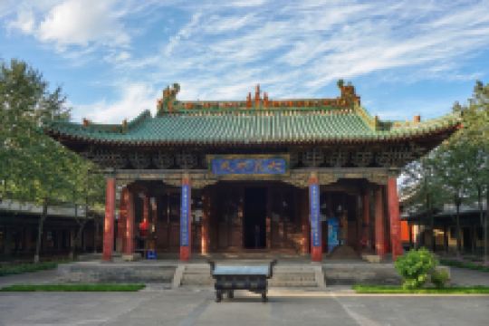 该建筑主殿面阔三间、进深三间,单檐歇山顶,上覆琉璃瓦。殿前置面阔三间、进深两间的抱厦,为清代所增建。大殿没有台基,由平地立柱砌墙。 殿内后端置内柱两根,柱间各置雕刻精细的木质神龛一个,结构均为重檐。檐下斗拱共十一踩,排列密集纯系装饰,为清代结构。殿内清代增置的平棋藻井上绘制的龙形图案,多姿多态,别具一格。