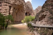 炳灵寺入口处悬崖旁边伫立着峻峭的姊妹峰,周围有鸳鸯洞、药水泉等胜境,山青水秀,峰险石奇。