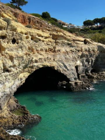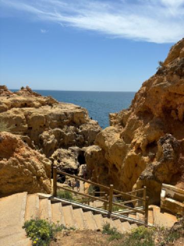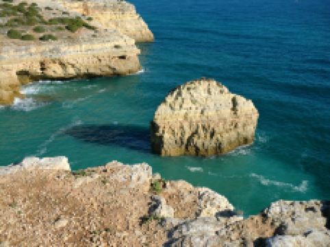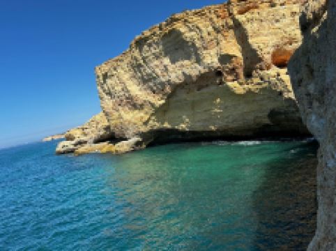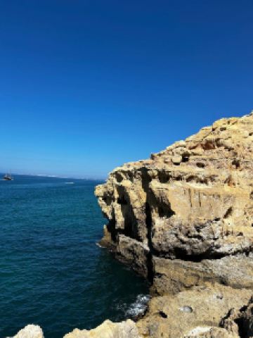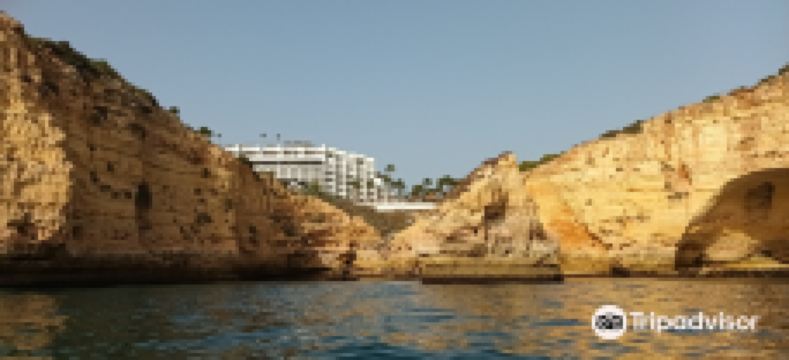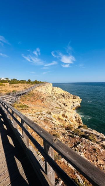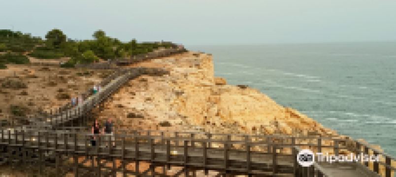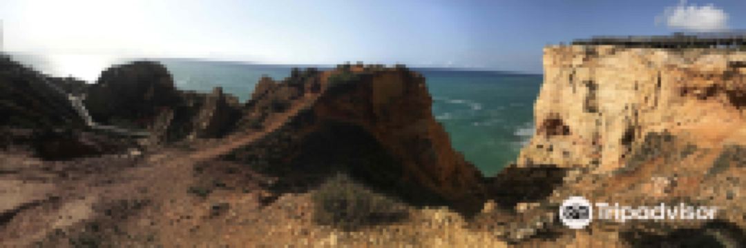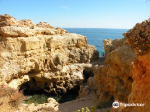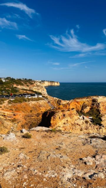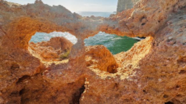 Algar Seco是葡萄牙的一处自然奇观,位于风景如画的卡尔沃埃鲁小镇附近。这里的地质是经过数百万年的海水侵蚀和风化作用而成的,海岸线由石灰岩构成,经过长时间的自然雕琢,形成了壮观的悬崖、洞穴和拱门。这些奇特的岩石结构在阳光的照射下呈现出金黄色和橙色的色调,与湛蓝的海水形成鲜明对比,景色十分壮观。游客可以通过一条木制步道探索,这条步道沿着海岸线蜿蜒而行,提供了多个观景点。这里的洞穴和拱门是吸引人的地点之一,通过它可以看到大海的美景,是拍照留念的热门地点。它以其独特的地质景观和迷人的自然环境,为游客提供了一个探索和欣赏大自然景色的去处。