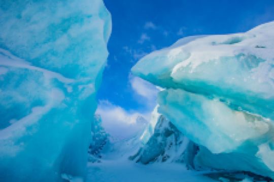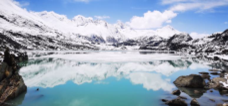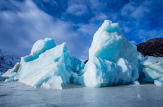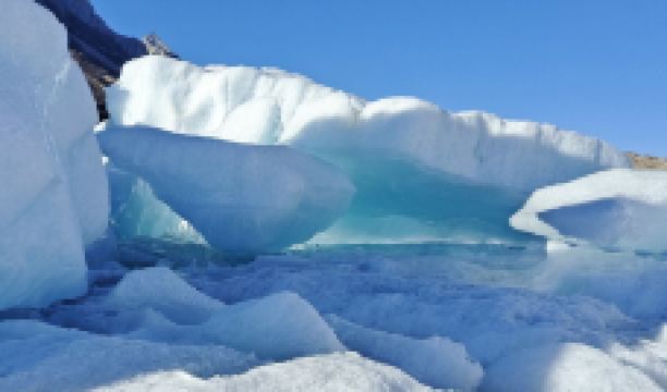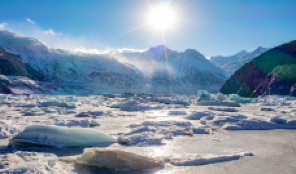 围绕着来古村的多条冰川,在村子前形成了多个冰湖,因不同的冰川所在的地质和土壤成分不同,每一个冰湖都会反射出不同的颜色,有一个冰湖上还漂浮着大大小小的冰山。冰川的末端与冰湖之间,断裂的冰川露出十数米高蓝幽幽的冰层。