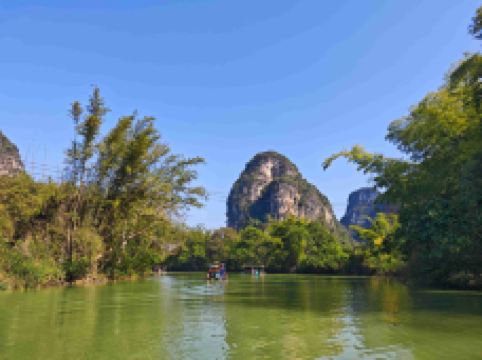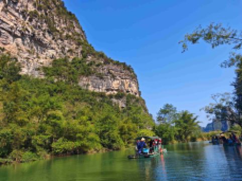 竹筏漂流是游玩景区热门的方式,可以先到达下游的明仕田园壮族民居博物园,在此购买漂流票,有观光车可以将游客送至漂流起点。漂流一共约1个多小时,船上配备导游可以一路讲解。漂流的路上能看到倒映在河水里的秀美山峰,景色和桂林的黄布倒影等风光十分相似;还会经过阡陌纵横的农田区、安静的村庄等,一幅幅乡村画卷让人心旷神怡。