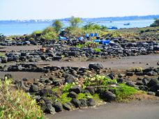 景区所在的盐田村是个平静悠闲的海边村庄,入村后,一眼就可看到海边散落着大小不一的石槽,它们像一方方砚台错落有致地分布在一垄垄的盐田周围,颇为壮观,而盐田不远处就是名的洋浦港,停泊着来往各国的货轮。