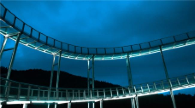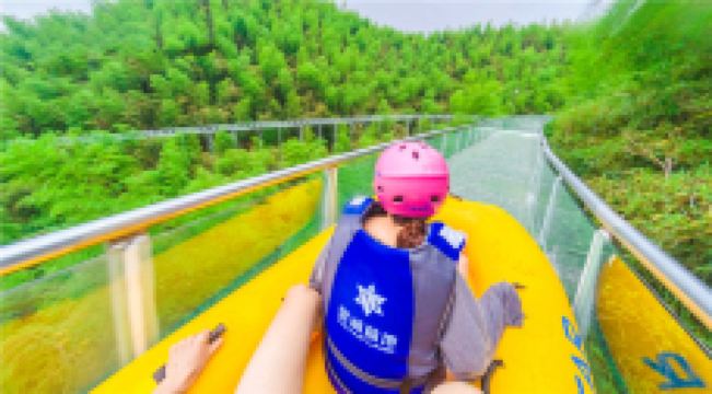星潮营地云霄飞渡玻璃漂流位于浙江省安吉县上墅乡星潮营地内,身处AAA级景区刘家塘村之中,毗邻狮子石水库,坐拥万亩竹海森林,青山绿水环绕,亲近自然,悠闲舒适。云霄飞渡玻璃漂流充分发挥得天独厚的原生态 自然景观和地理环境优势,悬浮于竹海之上的全透明玻璃水滑道,带来更高、更快、更爽、更刺激的全面升级体验。