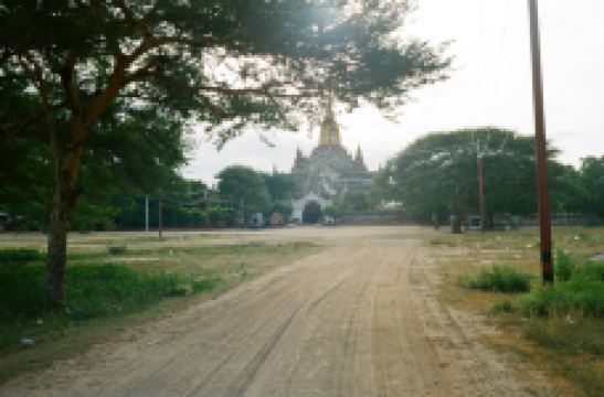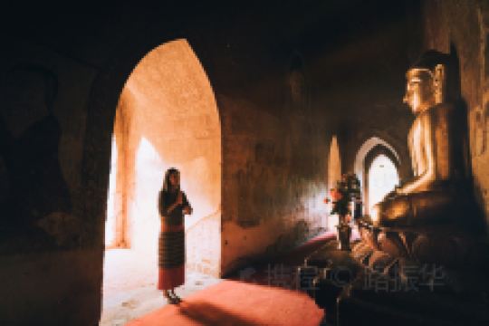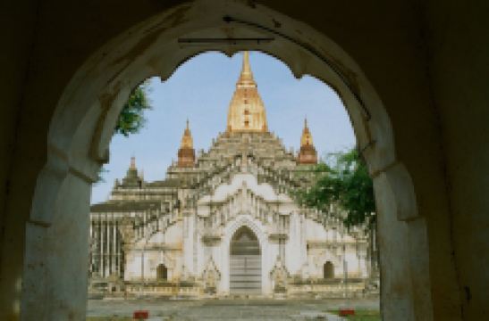 阿南达寺位于蒲甘古城墙的东面,建于1105年,是蒲甘现存得比较完整、造型比较美的佛教寺庙,以对称均衡之美闻名。寺中间的佛塔建筑工艺大大超越了之前的佛塔,并且融入了特别的风格。到访阿南达寺的游客和当地人都很多,在寺外常能看到集市,从沙画、木雕、明信片到服饰等种类繁多,还有饮料摊,十分热闹。阿南达寺集古代建筑之大成,整个寺院呈正方形,占地近百亩,是完全对称的形态,四面各有一条长长的走廊通向中间的院子。脱鞋后方能进入寺庙。寺院的正中间就是阿南达塔,高约51米,白色的塔身层层叠叠,玉米穗一般的印度式尖塔则涂满了金箔,并镶嵌着无数光彩夺目的珠宝,在阳光照射下显得尤为宏大耀眼。佛塔的外壁上有上千大小佛像和佛本生故事的彩陶浮雕,虽历经风雨只能略见绿底,但依然能看出世尊苦修、冥想然后彻悟成佛的过程。在主塔的周围又环绕着众多的小塔、佛像及各种动物、神兽雕像。佛塔的底座是印度风格的正方形大佛窟,东南西北面皆有一座高门,门内各是一座高约十米、姿态不同的站立金佛。其中南北两尊是原有的金佛,而东西两尊曾损于火灾后重建。南面的金佛令人叹为观止,据说远看时大佛笑得非常慈祥和蔼,而走到其脚下抬头望去,法相却变得十分庄严,令人不由自主要膜拜。每天早上都能看到许多当地人和各方香客来此朝拜、献花,弥漫着虔诚的氛围。入夜后,灯光会照亮金色的塔顶,金光璀璨,远远就能看见,是蒲甘的一大标志。塔内还有双层回廊,并有双层窗户以采光。回廊的墙壁上有上千处佛龛,供着大小不一的金像,值得细细观赏。佛塔之外是一个开阔的内院,你可以在这里近距离欣赏佛塔金碧辉煌的尖顶。