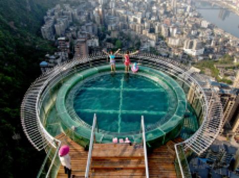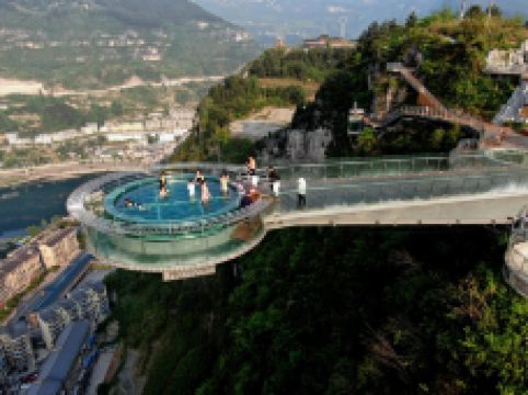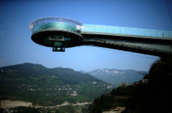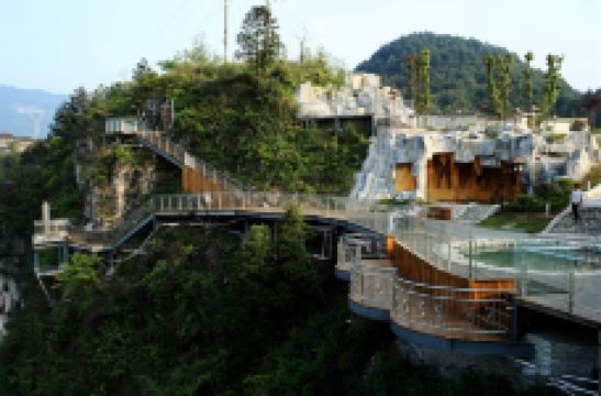 悬崖温泉建在乌江崖岸并紧临古城“城际线”的兽王山顶,距离奔腾乌江大约200米,比城市“中间线”高出180余米。