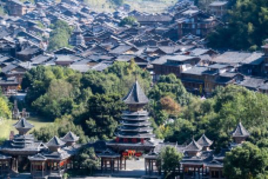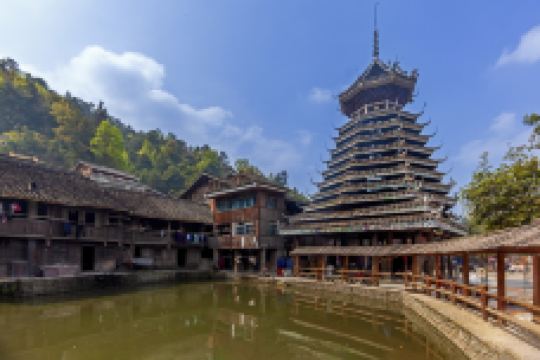 作为侗寨的标志,鼓楼建筑结构严谨,工艺精湛,整个建造不用一钉一铆,因而也是侗族建筑技艺的集中体现。鼓楼集塔、亭、阁为一体,有塔的雄壮、亭的秀美、阁的雅致。