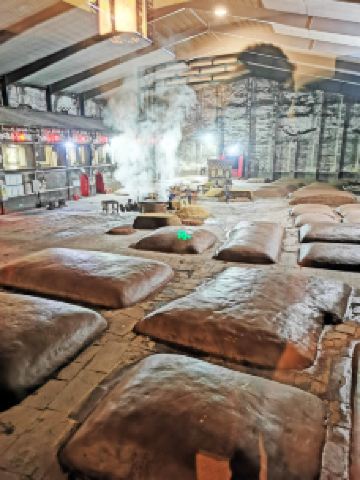 泸州老窖国宝窖池系明代万历年间所建,仅存四口,是我国建造早,保存好,持续使用时间长的曲酒窖池。四口窖池规模相当,呈横向排列于车间内,皆长3.8米,宽2.4米,深2.4米,均为鸳鸯窖,即每口窖池内为2个地坑,中间以池干分开,粮糟发酵时,2个池坑作为一个窖池,以提高容量。窖池内的糟泥经数百年发酵,已产生了数千种有益微生物,不喝窖酒,但闻泥香,已有飘飘欲醉之感了。这4口明代老窖池,是中国现存建造早、持续使用时间长、保存好的酒窖池,也是被作为全国重点文物保护单位的窖池,有很高的科学研究价值。