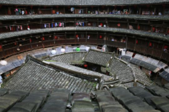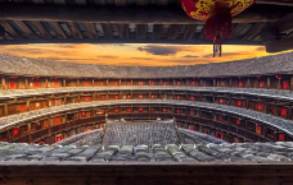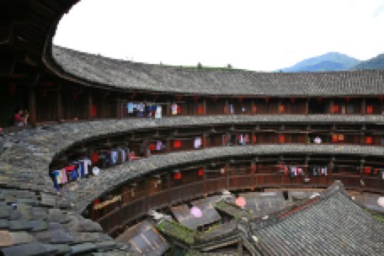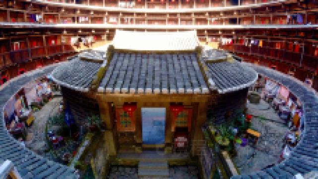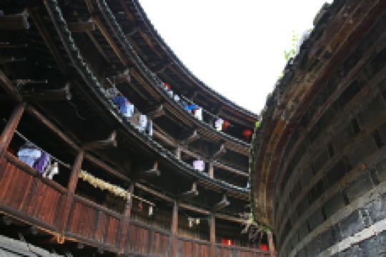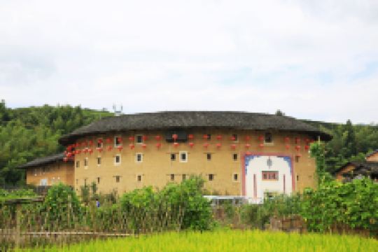 怀远楼建于1905-1909年,是目前建筑工艺精美、保护好的双环圆形土楼。楼高四层13米,直径38米,每层34间,共136间,为简氏家族所建。怀远楼引人注目之处在于内院核心位置的祖堂,也就是家族子弟读书的地方“斯是室”。“斯是室”精巧秀气,上下堂建筑占地190平方米,室内雕梁画栋,古朴天然,书卷气浓。怀远楼为二环楼,建筑师是振成楼的建筑师,楼的设计相当工整。楼内有块何应钦赠送的金匾“助我义师”,楼前平地有块用鹅卵石排成的太极图案。土楼和村子被水稻田和茶山包围着,一幅安宁的田园图。怀远楼的楼基用巨型鹅卵石和三合土垒筑3米多高,墙体至今光滑无剥落。站在楼外墙边把脸贴着墙向上看,能看到楼基下围小,中间大,上层又逐渐缩小,好象橄榄状,此结构符合力学,可抗风,使楼更结实。