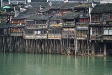 沱江边的土家吊脚楼多在东门虹桥和跳岩附近,一端是河岸,另一端是清波流转的河面,根根木柱支撑起一排排的吊脚楼,将其稳稳当当地悬于沿河两岸。碧绿的沱江之水顺着古城从窗下缓缓流过,吊脚楼倒映在清流之中,时不时有船篷划过,带起一层层涟漪,水中倒影也跟着朝四周悠悠荡开,别有一番水乡风情。