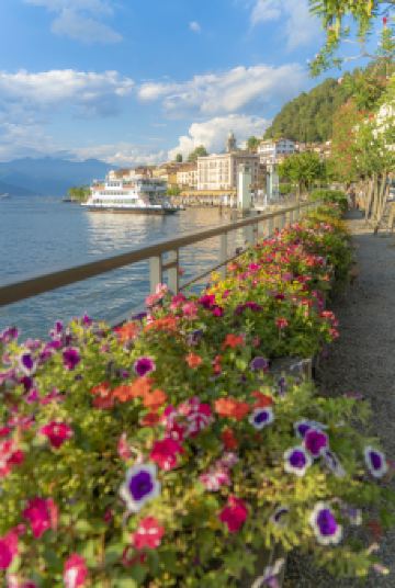 Bellagio作为世界上大受欢迎的旅游胜地之一,位于科莫湖中央的岬角尖上,提供前往湖两个支流方向的渡轮服务,游客可以在Bellagio参观翠绿的Serbelloni别墅公园和Melzi别墅。岬角曾经被继续人工伸向湖里,将湖水分割成两个较低水位的支流,这是亚历山德罗·塞贝洛尼的心血结晶,他是当时伦巴第高贵富有的家族首领之一。