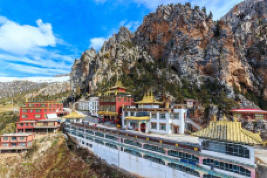 尕尔寺是一座直贡噶举派的寺院,坐落于一座海拔3700多米的高山上,分为上寺和下寺。山的北面全是奇峰怪崖、寒风料峭,但南边却是略有坡度、温暖向阳。尕尔寺的数百间建筑,就不规则的分布在山南边的这个大山坡上,从下至上,直到山顶。
