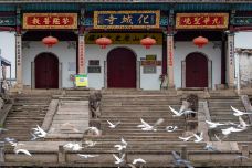 化城寺位于池州市东南50公里处的佛教胜地九华山风景区上,早在东晋隆安五年(公元401年)已有僧人在此筑庵,唐至德初年(公元756年)建寺,被认为是地藏菩萨转世的新罗国(韩国)王子金乔觉(金地藏)在此传经布道。化城寺是九华山风景区的开山祖寺,历史悠久,同时也是地藏菩萨道场。化城寺在山上的食宿大本营九华街的中心位置,由九华街步行到达非常方便。寺庙两旁是一家挨着一家的小商铺,门前的月牙池据说是地藏的放生池,白墙黑瓦的寺庙和商铺倒映在池子里,能拍出漂亮的照片。月牙池附近有一娘娘塔,仅剩塔基,据说是为纪念金地藏的母亲而建。寺庙主体建筑沿中轴线排布,共四进,由南到北依次为灵官殿、天王殿、大雄宝殿、藏经楼,前三进为清代建筑,后一进为明朝建筑。漂亮的要属大雄宝殿,窗户上雕着花,门楣刻有冰纹,在恰到好处的位置鎏着金,进入大殿一定要抬头看屋顶,藻井上彩色的“九龙戏珠”雕饰为艺术珍品。作为九华山历史文物馆,化城寺的庭院回廊中挂着一幅幅展示九华山山水的字画,陈列着文物。值得一看的精品有:明代无瑕和尚用针刺破舌头,笔沾舌血写成的《华严血经》,无瑕和尚的肉身则在百岁宫可以看到;金地藏穿过的巨大的鞋子和帽子;明代青铜谛听,谛听是金地藏的坐骑;清康熙、乾隆帝的御书手迹等。