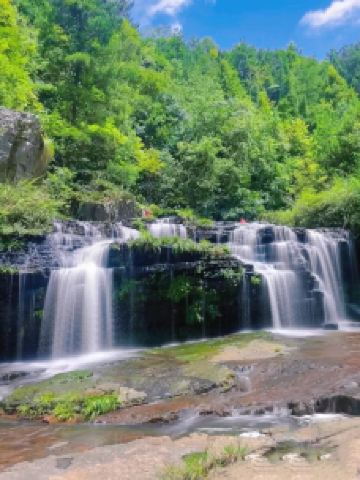 摆弓岩瀑布位于贵州省贵阳市花溪区,瀑布飞流直下,壮观不已,周围树木葱郁,杜鹃花盛放,美不胜收。