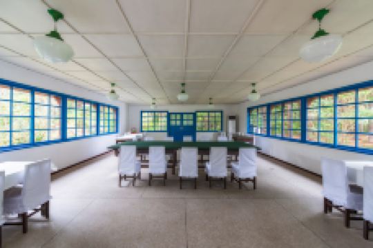 军事停战委员会会议室、中立国监察委员会会议室等7座木制单层建筑一字排开,其中三幢蓝色建筑是当年朝中方面所建,由朝中方面管理,四幢白色建筑是“联合国军”所建,由“联合国军”方面管理。一条宽约50厘米、高约5厘米的水泥标志线横在这些建筑的中间,成为一条神圣的军事分界线。