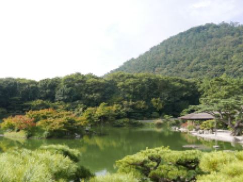 栗林公园位于高松市,面积大约为75ha。据说该园于1642年开始动工,前后花了100年的时间才完成。庭园內有6个水池、13座假山。与公园后方的紫云山风景遥相呼应,仿佛是一幅美丽的日本画。 在庭园的构造过程中利用远山的景色等使之成为庭园结构的一部分,这种手法叫做“借景”。南园是纯日本式的庭园,池边茶道用的小房子“掬月亭”,因作为秋天欣赏满月的好去处而被众所周知。北园经过大规模的改建,现已成了一座西式庭园。