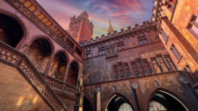 巴塞尔市政厅矗立在马尔克特广场上,是巴塞尔州府所在地,同时也是市政委员会所在地。 特别值得一看的是市政会议厅、美丽的内庭、富于浪漫气息的拱廊和宏伟的高塔。