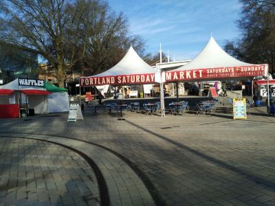 波特兰周六市场是美国最大的连续经营的露天手工艺品集市。从每年三月到圣诞前夜的每个周六和周日,周六市场都会在西南Ankeny 街和NaitoParkway 街之间开放。周六市场有超过350 个摊位,每年可以创造八百万美元的销售额,并吸引一百多万游客来到波特兰的历史老城区。所有在周六市场上出售的工艺品都是手工制作。评测委员会根据严格的质量标准对每一项新产品进行评估,看其是否合格在这里出售。