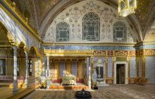 华丽装饰,金色叶片和雕刻大理石的圆顶
