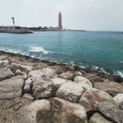 3、东侧的海滩区,沙滩上一字排开当地曾经的水上交通工具--木船,与背景的高楼大厦形成鲜明的对比,现代与古老的气息激情碰撞。海滩的白沙很细,海水呈热带海洋标志性的蓝绿色,水波纹理细腻灵动,在阳光下犹如蓝宝石。另一侧海岸是帆船、游艇的停靠码头,当地租用码头的费用不菲,长期来算甚至比买船还贵。码头与背景的“Rixo Marina酒店”同框,此拱形酒店与前天的“亚特兰蒂斯酒店”外貌相似,还未建成,看规模估计也是七星级标准。