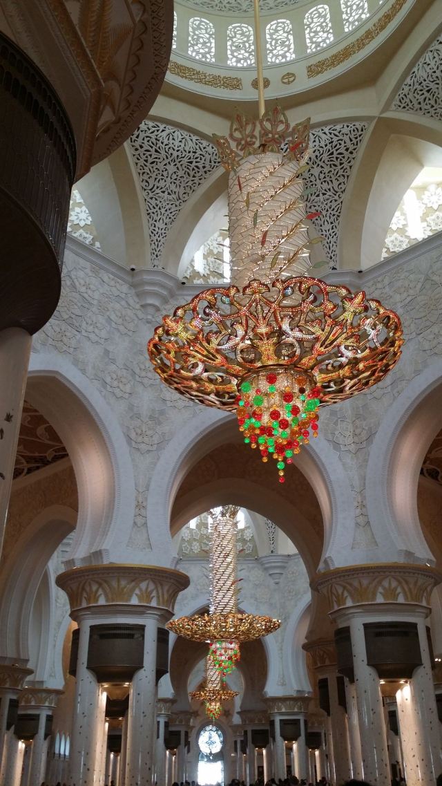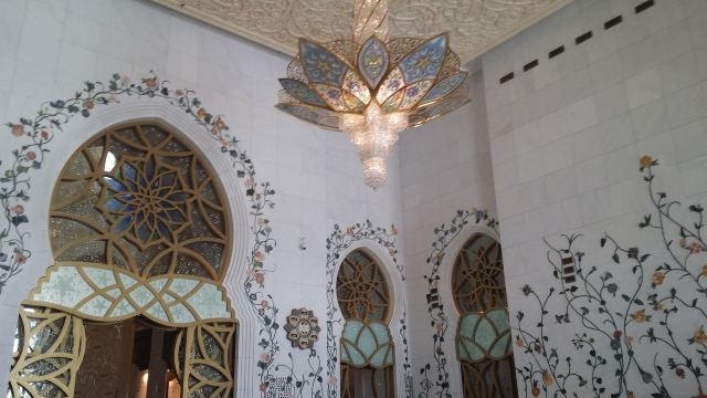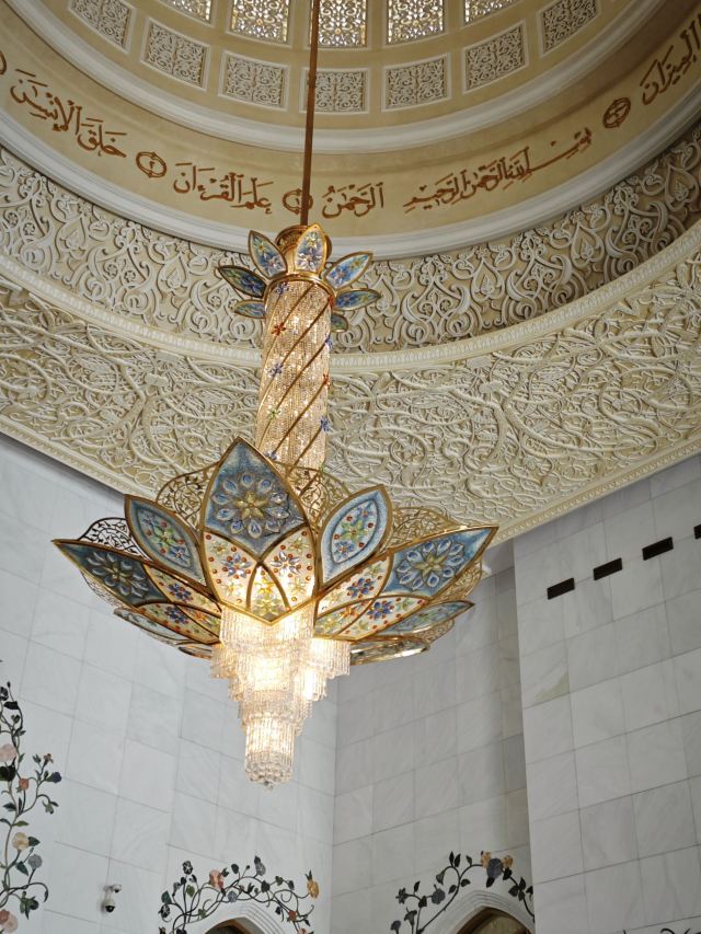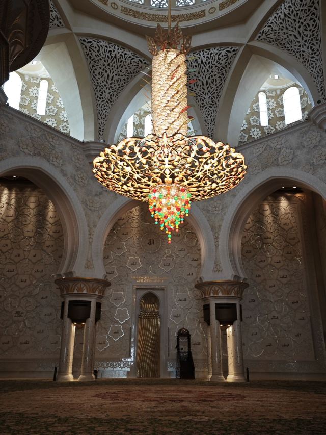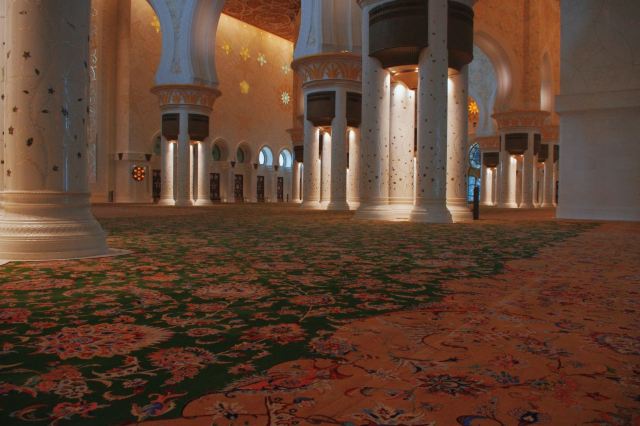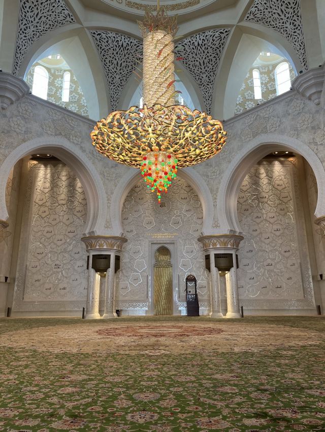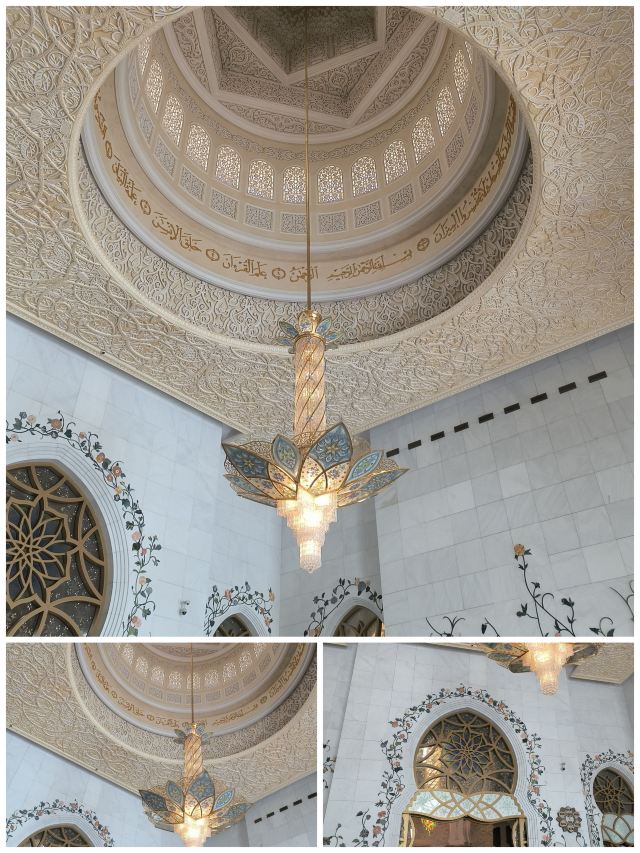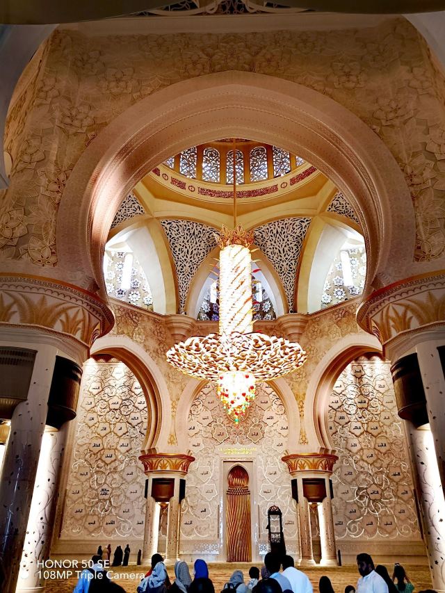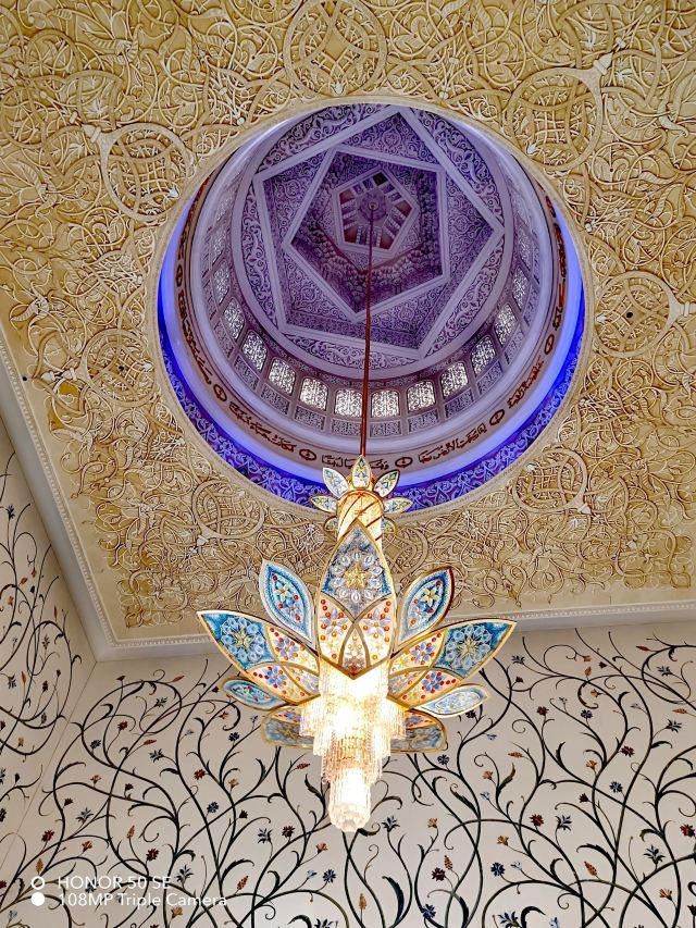 5、清真寺规模宏大、装修奢华,四角的宣礼塔上的金色都是真金贴上去的,总共用了46吨黄金,建筑用的大理石和汉白玉是从欧洲进口的。礼拜厅地面铺着世界最大的手工波斯地毯,面积5627平方公尺,比足球场还大,由1200位伊朗女性历时1.5年编制而成,重35吨,共打了22亿个结,使用20种天然染料永不退色,估价1000万美元;头顶是阿联酋第二大水晶吊灯(最大的在刚刚去过的“阿布扎比总统府”内),重9吨,由德国公司纯手工制造,用上万个水晶、黄铜和玻璃组成的;厅墙壁上挂有当日做礼拜的5个时间,进入现代,穆斯林普遍都有工作,很难在5个时间都做礼拜,会挑一个时间做长一点。