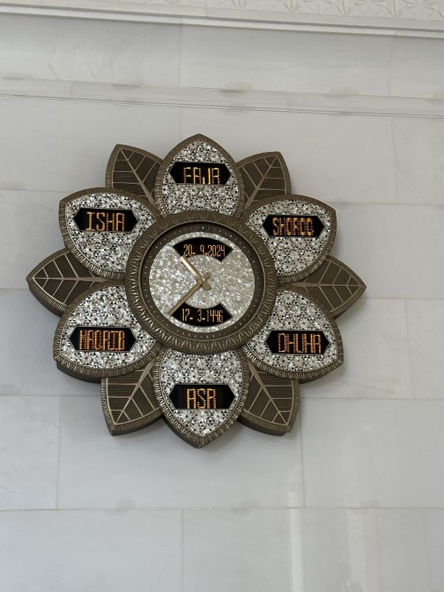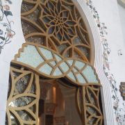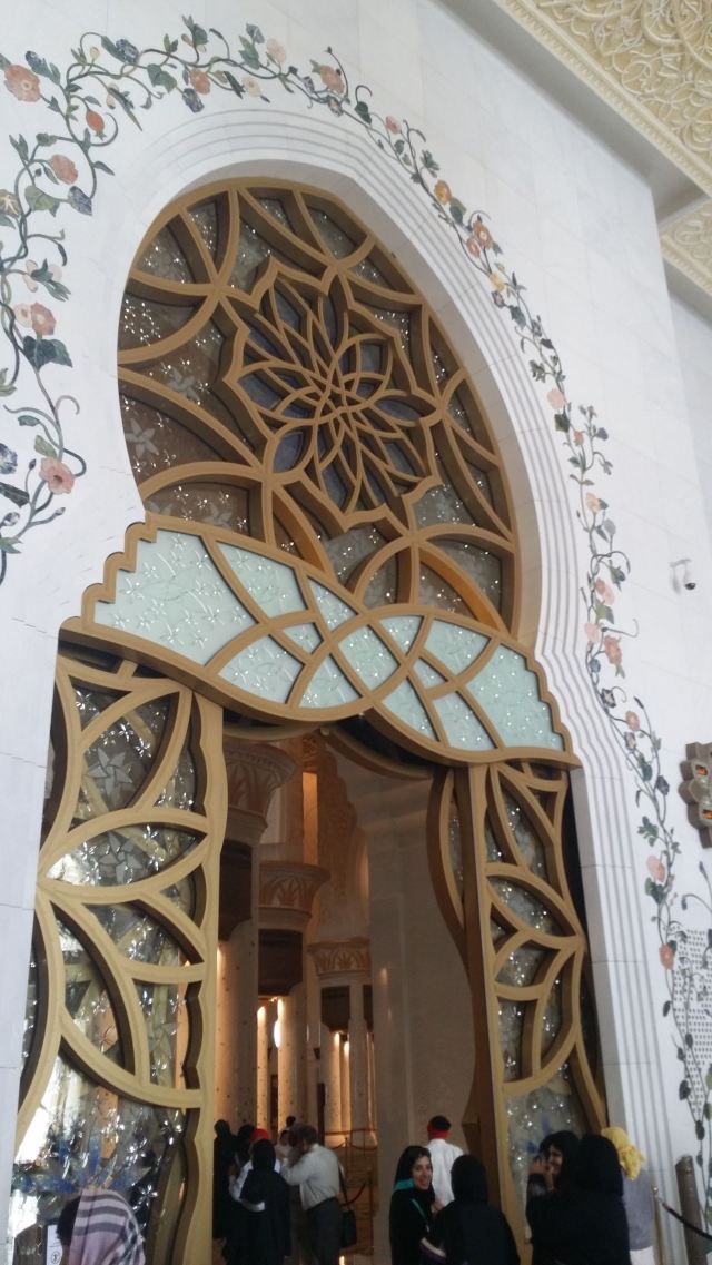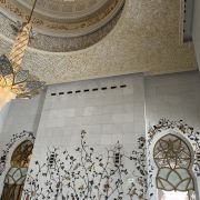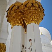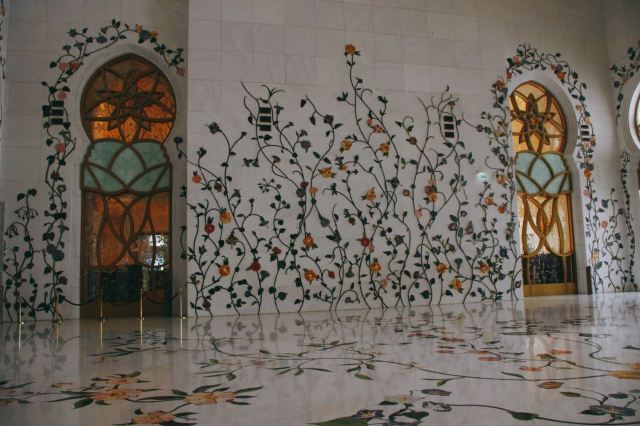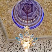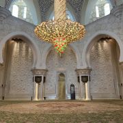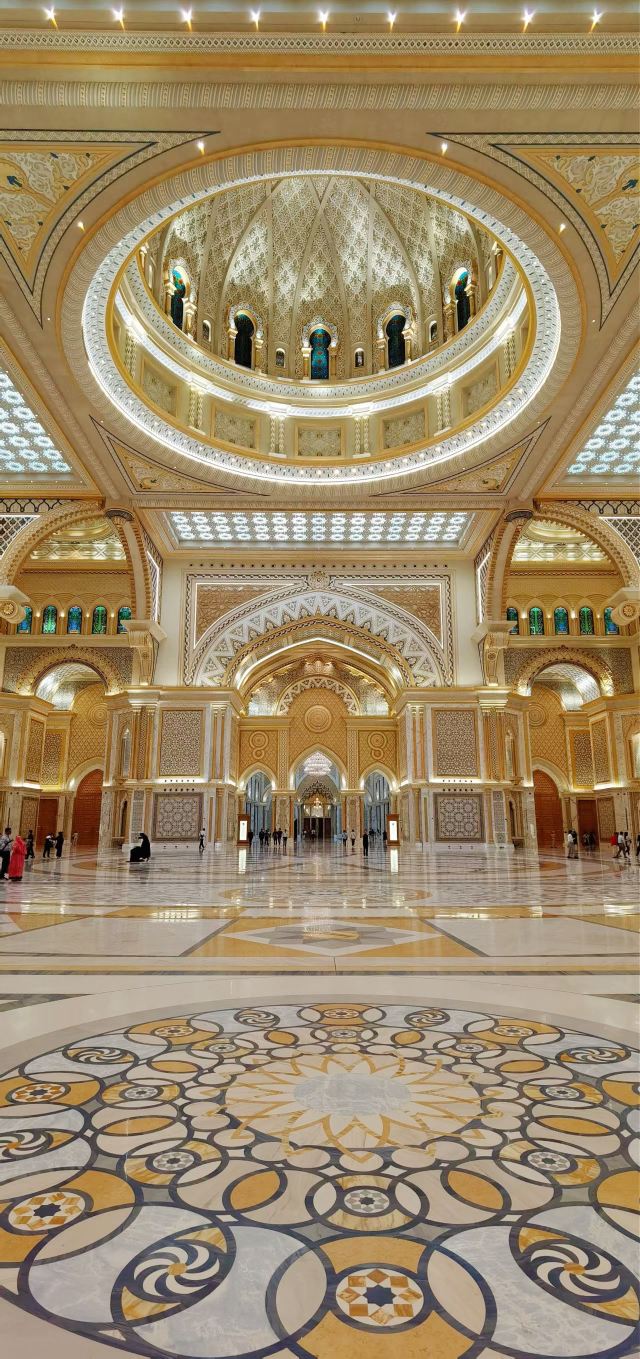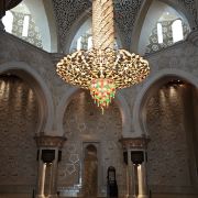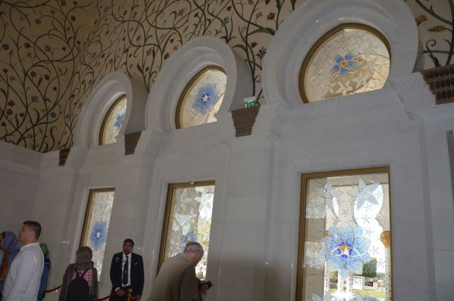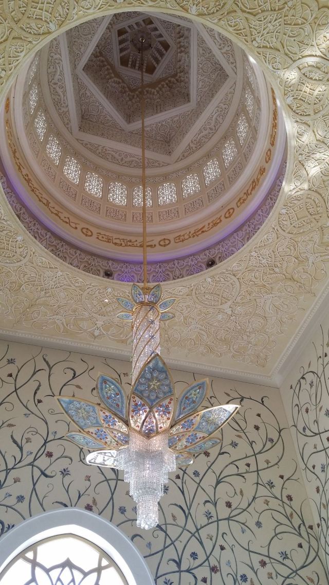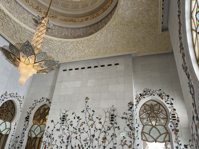 5、清真寺规模宏大、装修奢华,四角的宣礼塔上的金色都是真金贴上去的,总共用了46吨黄金,建筑用的大理石和汉白玉是从欧洲进口的。礼拜厅地面铺着世界最大的手工波斯地毯,面积5627平方公尺,比足球场还大,由1200位伊朗女性历时1.5年编制而成,重35吨,共打了22亿个结,使用20种天然染料永不退色,估价1000万美元;头顶是阿联酋第二大水晶吊灯(最大的在刚刚去过的“阿布扎比总统府”内),重9吨,由德国公司纯手工制造,用上万个水晶、黄铜和玻璃组成的;厅墙壁上挂有当日做礼拜的5个时间,进入现代,穆斯林普遍都有工作,很难在5个时间都做礼拜,会挑一个时间做长一点。
