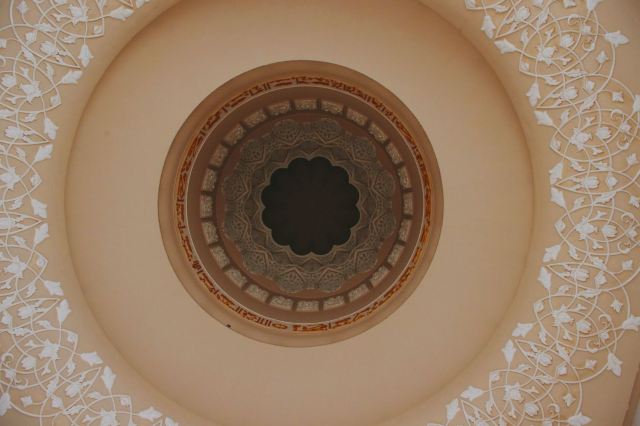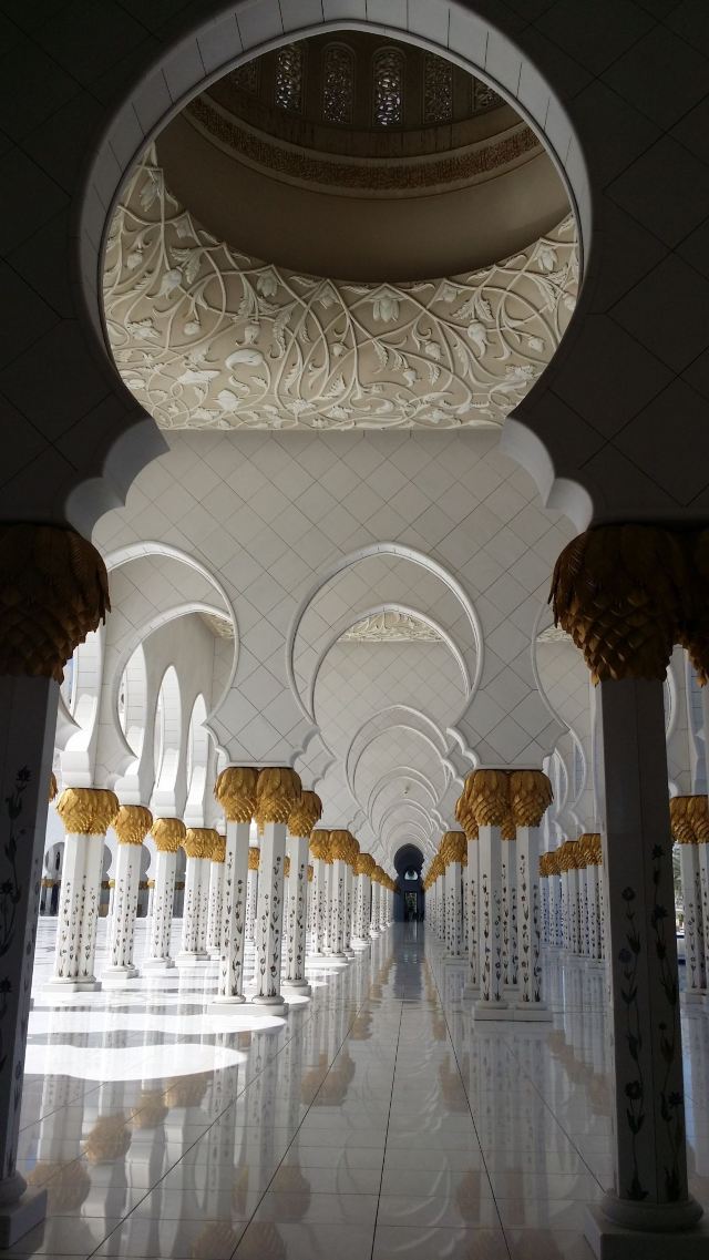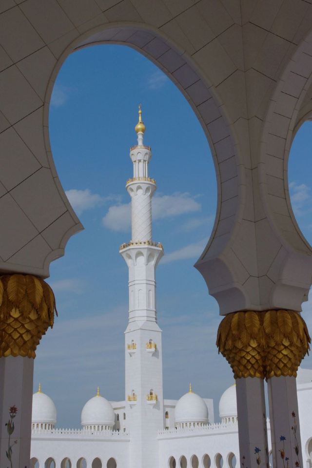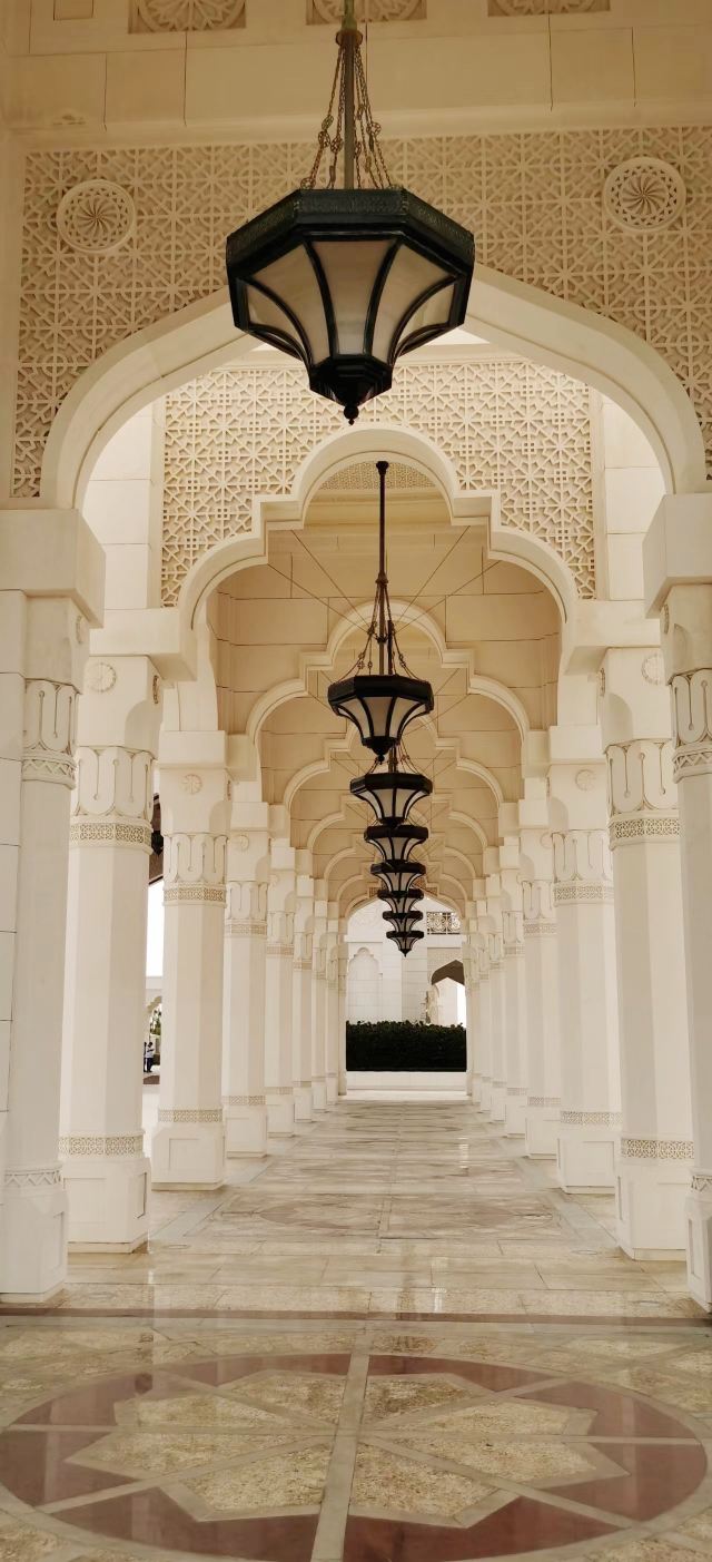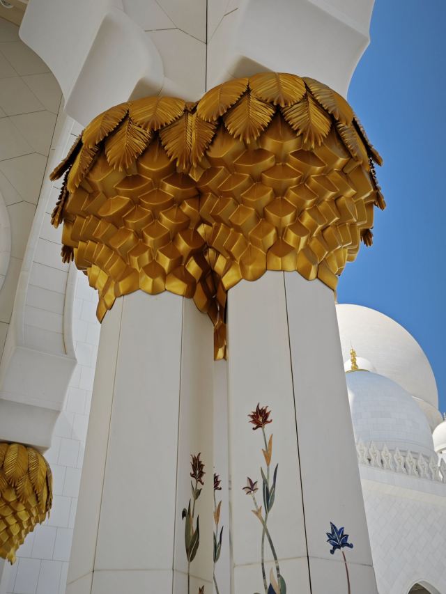 扎耶德清真寺共有4个尖塔 每个高107米 并有57个圆顶 均由汉白玉精雕而成 廊柱上光黄金就用去了46吨 对 是吨 吃不吃惊 意不意外 而这些仅仅只是门面