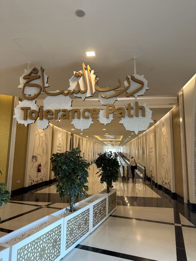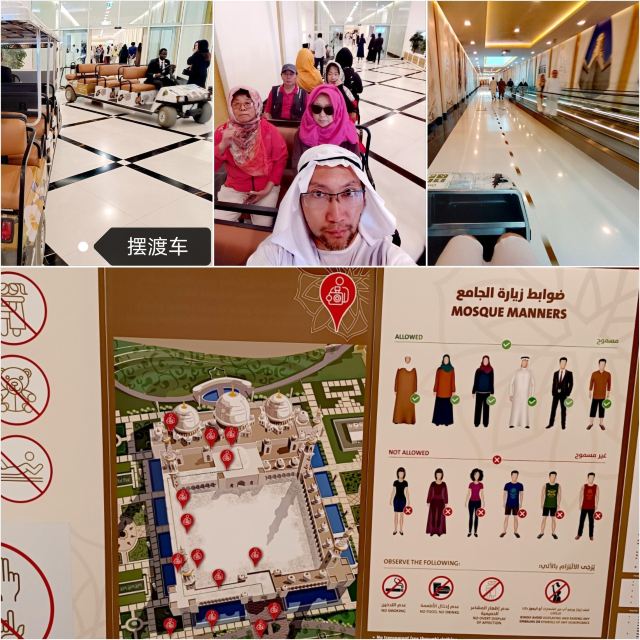 3、进寺前先要走一段挺长的地下通道,运气好能碰上摆渡车代步,通道两侧的商铺值得一逛,见到有游客买了阿拉伯白袍黑袍准备进寺拍写真,而我穿着从国内网上27元买的阿拉伯白袍,还特地留了一周胡子,很应景,让回头率几乎为0。上到地面,清真寺门前的2个半月形喷泉是很好的拍照点,只是下午迎着太阳拍照效果不佳。