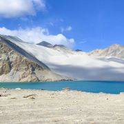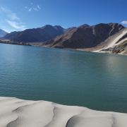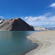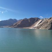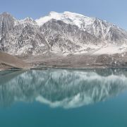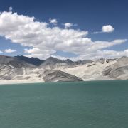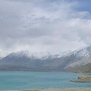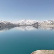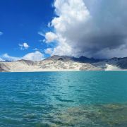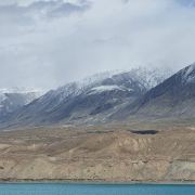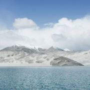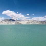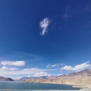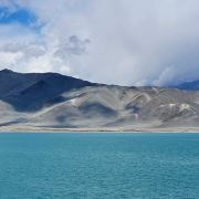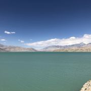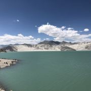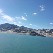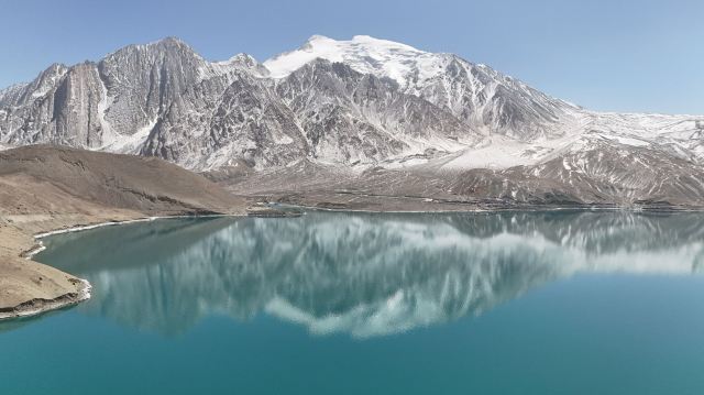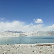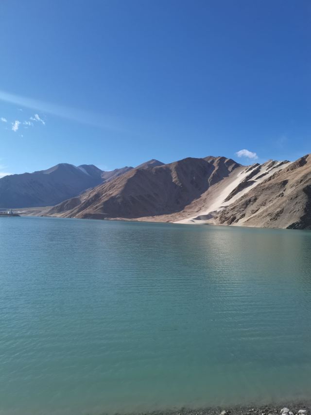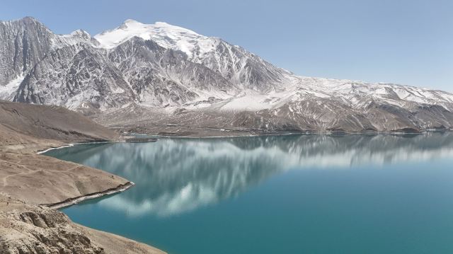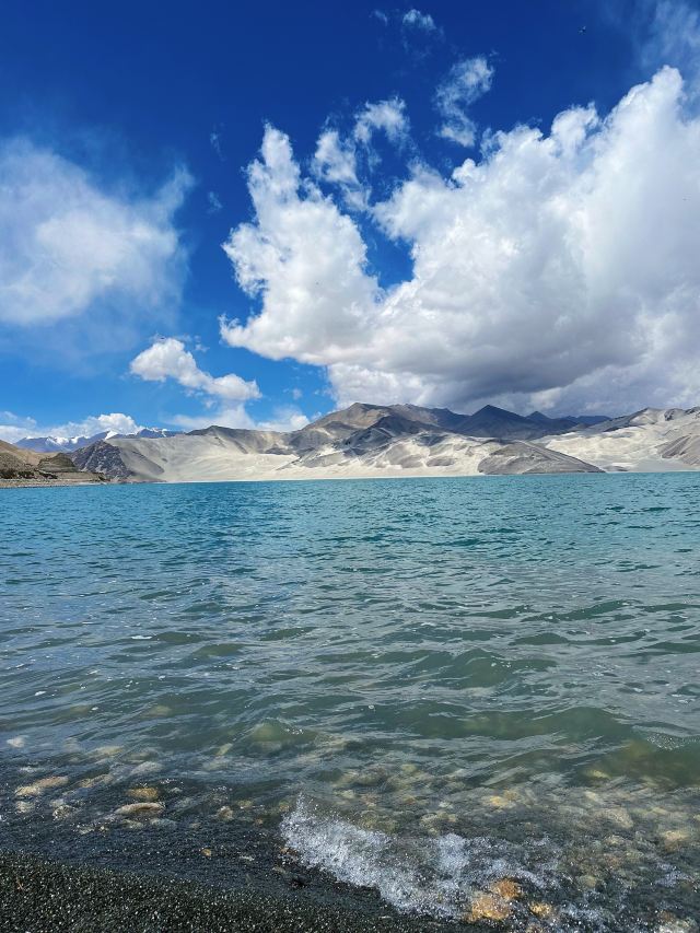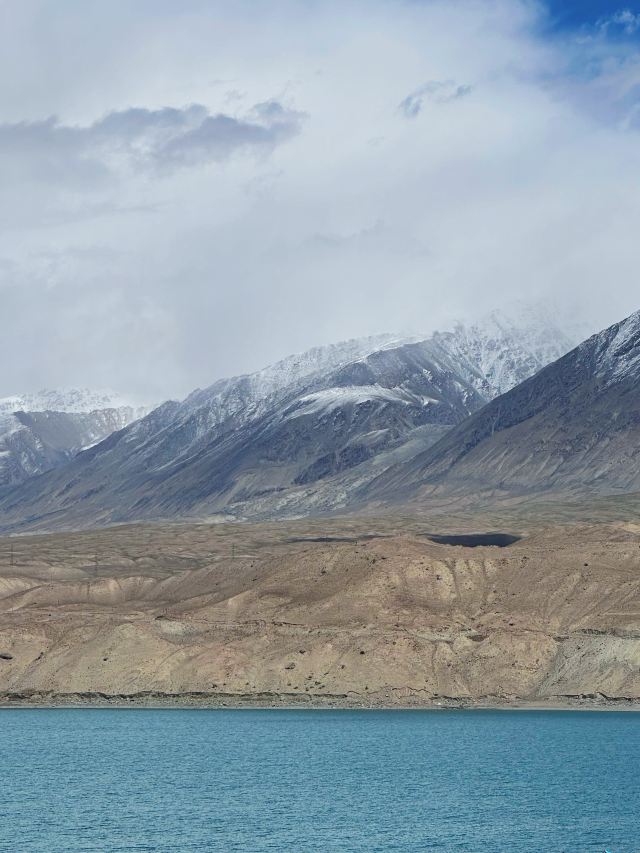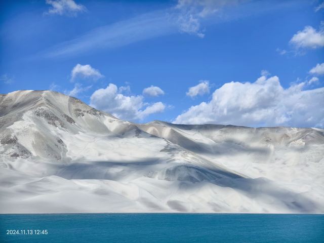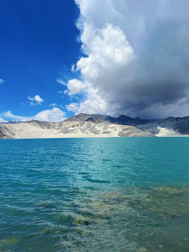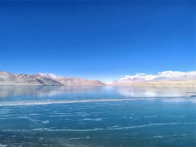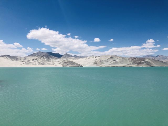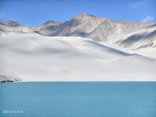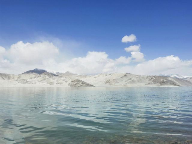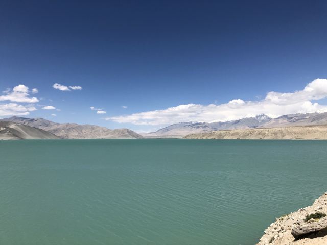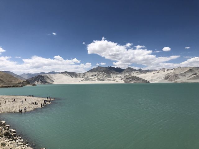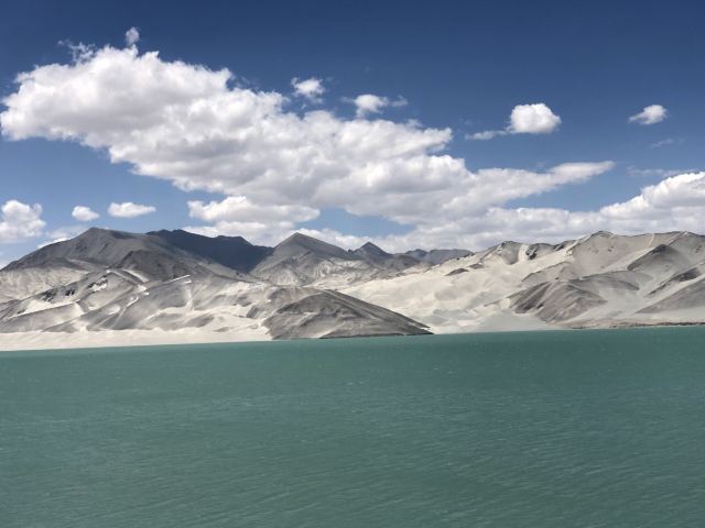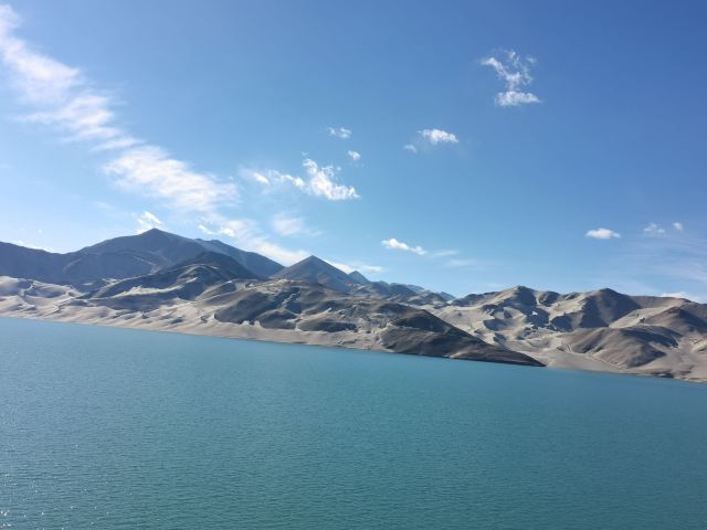 可以看到湖水纯澈,山峰雄伟。公格尔九别的卫峰aklangam7004米到白沙湖仅10公里,高差400米。再左边黑色的无名山如刀削一般,其间条状的冰反射阳光如水银一般。右边湖对岸有巨大的沙丘,后面就是克州冰川公园阿依拉尼什山的背面。