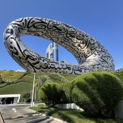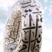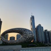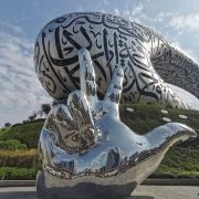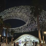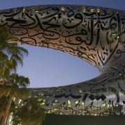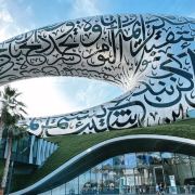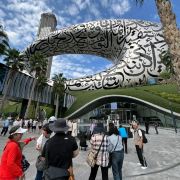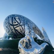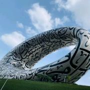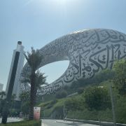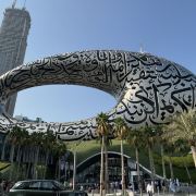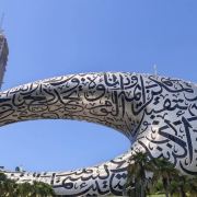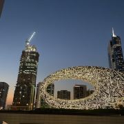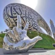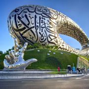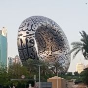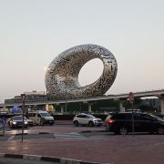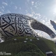 据说这个建筑是人类修建的最复杂的建筑之一,它的外形是一个巨大的椭圆形空心圆环,代表着人类的智慧和力量。外面的阿拉伯文字般的书法,是阿联酋统治者谢赫.默罕默德关于迪拜未来主题所书写的诗歌。