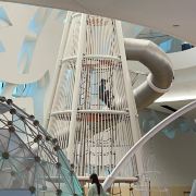 纯白色大厅没有一根实体柱,子弹头一般的两部电梯不断上下往来,很有通往未来世界的感觉。