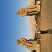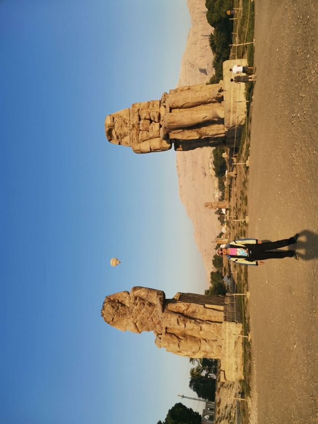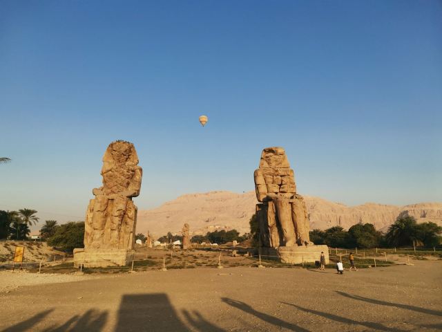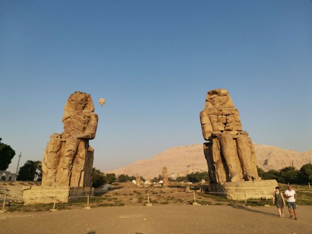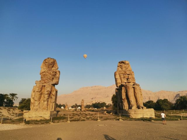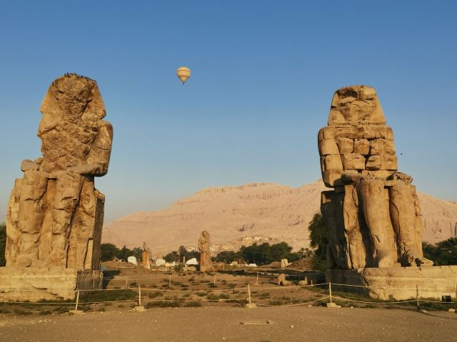 5分 超棒哭泣的门农巨像高20米,风化严重,面部已不可辨识。巨像矗立在尼罗河西岸和国王谷之间原野之上,原来是“阿蒙荷特普(AMENHOTEP)三世”法老原葬祭神殿前的雕像,但到了托勒密王朝时代,建筑物已经完全被破坏了,神殿本身已无踪影。人们认为石像是希腊神话中的门农的雕像,就给石像取名为门农像。罗马统治时期的地震使雕像出现了裂缝,每当起风的时候,右边的门农石像就会发出声响,好像在唱着一首幽怨的歌声一样,十分神奇,古希腊人将这个现象与攻占特洛伊城的悲情英雄门农的故事联系起来,就叫石像为哭泣的门农石像。石像后来经过修补之后的门农像,就再也没有唱过歌。仔细观察游客可以看出两尊坐像有一个明显的区别,左侧的为一整石雕成,右侧的是由石块砌成(据说就是这个石像会唱歌)。回想起清晨乘坐热气球俯瞰石像,在滚滚荒漠的寂寥中,门农仍以 20米高的坐姿永远地守护着身后早已消失的神殿,让人感慨万千。