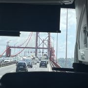 5分 超棒跟团旅游,大巴车过4月25日大桥,車观里斯本大耶稣像。