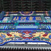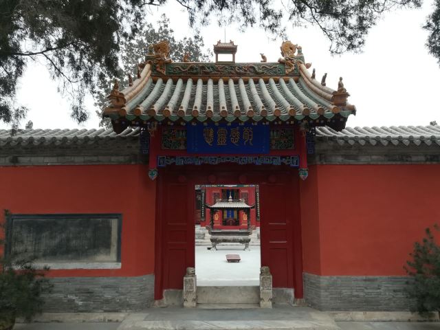 牌楼建于清嘉庆23年(公元1818年),高8.4米,为三间四柱三楼形式,单檐庑殿顶,琉璃瓦面。牌坊两侧有一对石狮,石狮外矗立着两根高达24米的铁铸旗杆,每根重约15吨。两根铁旗杆上铸有一幅对联:“铁树双旗光射斗;神庥普荫德参天。”铁旗杆上悬挂有风铃,风吹过时,声音特别悦耳。
